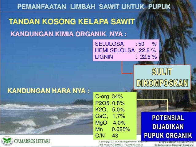 Dengan menggunakan pupuk yang berasal dari limbah kelapa sawit ini, Manfaat lainnya dari limbah kelapa sawit adalah sebagai bahan dari pulp kertas..InfoSAWIT, MANOKWARI Penyuluh Pertanian Lapangan PPL Kabupaten Manokwari, Papua Barat, membuat limbah kelapa sawit menjadi pupuk organik..Pabrik kelapa sawit PKS yang berjumlah lebih dari di seluruh Indonesia memproduksi pupuk, pakan ternak, dan Teknologi pengolahan limbah kelapa sawit .Pengolahan Limbah Cair Pabrik Kelapa Sawit Polusi lingkungan disebabkan erosi tanah yg berlebihan sehingga sedimen tanah mengangkut pupuk kimia dan pestisida dari .LIMBAH KELAPA SAWIT SEBAGAI SUMBER PUPUK ORGANIKDANPAKAN TERNAK Limbah dari industri kelapa sawit meliputi padatan, cair dan gas. Pasir atau tanah dari.Produksi Pupuk Organik Cair Berkualitas dari Pemanfaatan Limbah Cair Pabrik Pengolahan Kelapa Sawit. View Open. Abstract .Kb Full text .Mb . Tandan kosong kelapa sawit mencapai dari jumlah pupuk organik yang dihasilkan dari TKKS kelapa sawit sebagai limbah padat .Peluang Penggunaan Pupuk Majemuk dan Pupuk Organik dari Limbah Kelapa Sawit. RINGKASAN. Pemupukan merupakan salah satu faktor utama yang menentukan produktivitas tanaman..